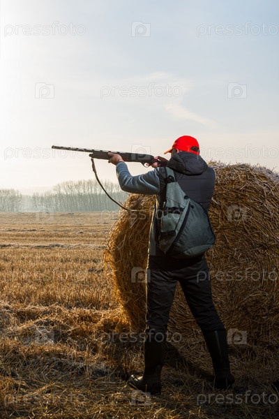 Мужчина-охотник стреляет в летящую птицу, фазана