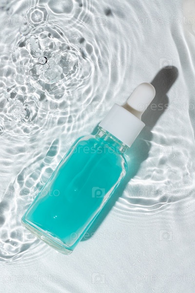 Небрендовый макет флакона-капельницы для сыворотки для лица на белом фоне водной поверхности. Косметическая косметическая процедура, уход за кожей, эфирное масло, гиалуроновая сыворотка, пустая этикетка