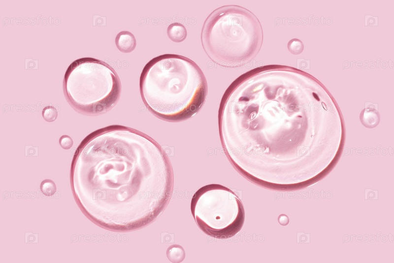 Чистые прозрачные капли косметического геля на розовом фоне, текстура глицерина для ухода за кожей. вид сверху