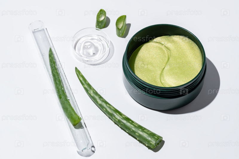 Глазные повязки и Алоэ Вера на белом фоне. Маска для кожи с экстрактом Алоэ. Лабораторные исследования
