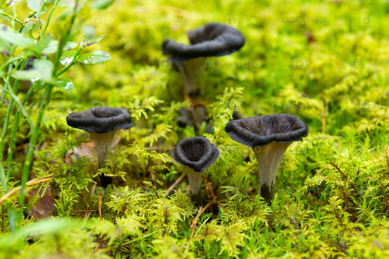 Craterellus cornucopioides, рог изобилия, черная лиса, чёрный труба или труба мертвых в зеленой мхе