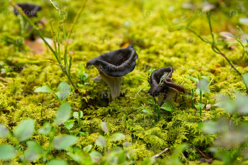 Craterellus cornucopioides, рог изобилия, черная лиса, чёрный труба или труба мертвых в зеленой мхе