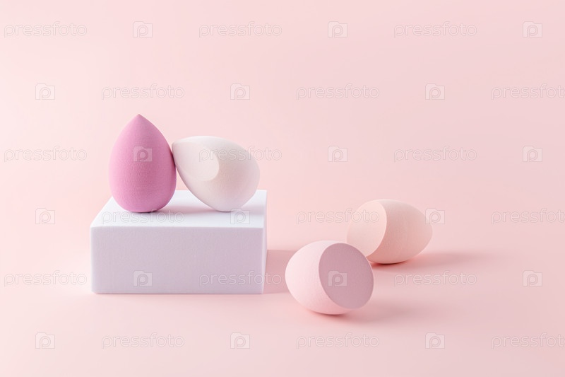 Шикарные блендеры в форме яйца в розовом цвете на белом квадратном подиуме и розовом фоне. Концепция ухода за кожей лица, инструмент для макияжа