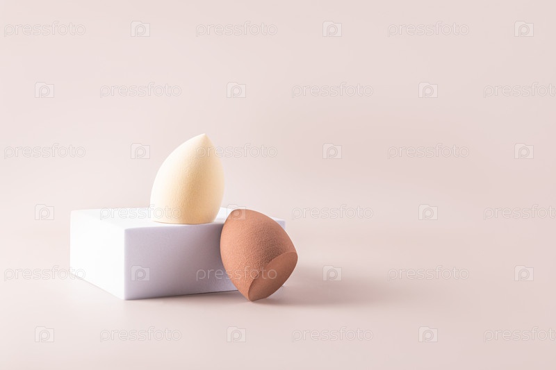 Две косметические губки-блендера в форме яйца на белом квадратном подиуме. Бежевый фон. Вид спереди. Концепция ухода и красоты. Инструмент для макияжа