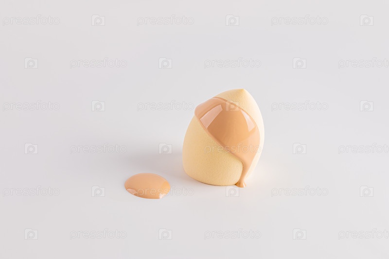 Пористый спонж-блендер красоты в светлом цвете с капающей каплей жидкой тональной пудры в натуральном тоне. Концепция ухода за косметикой, Инструмент