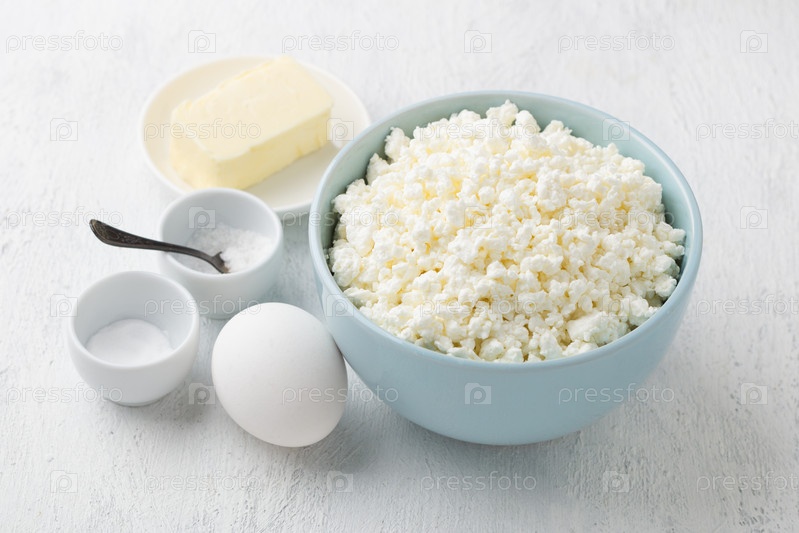 Состав: творог, яйцо, масло сливочное, соль, сода для приготовления домашнего плавленого сыра на светло-сером фоне
