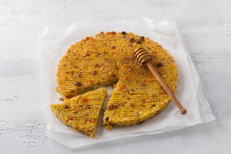 Запеченная веганская просяная лепешка с сухофруктами и орехами, посыпанная медом на светло-голубом фоне