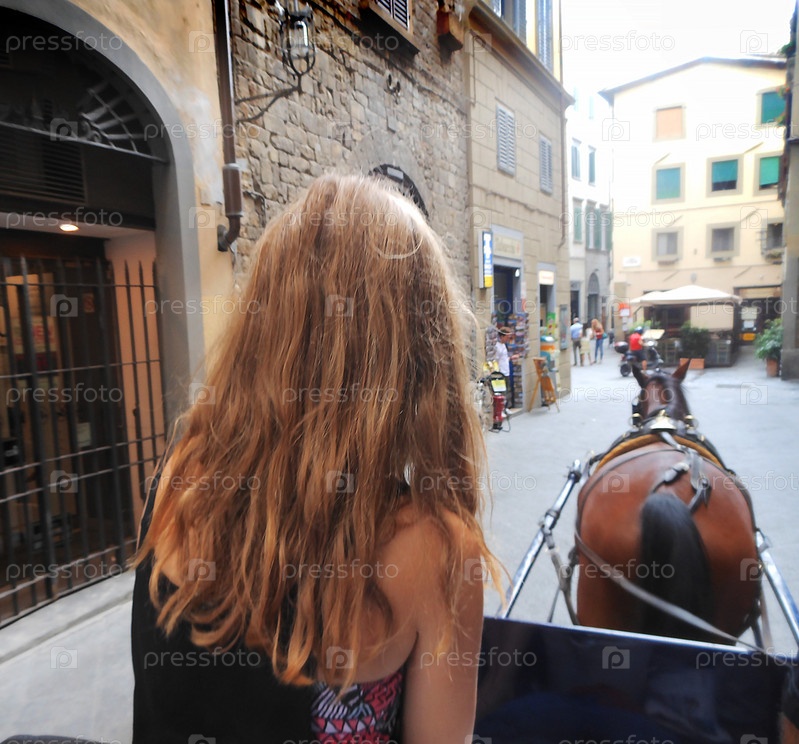 Концептуальный снимок девушки, едущей в карете. На открытом воздухе