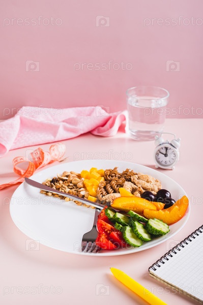 Концепция индивидуального плана питания по времени еда на тарелке на столе вертикальный вид
