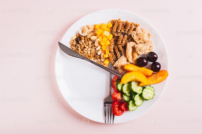 Концепция индивидуального плана питания по времени еда на тарелке на столе вид сверху