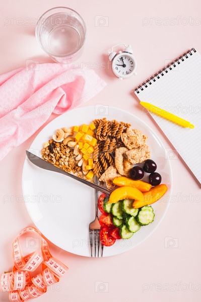 Набор здоровой пищи для индивидуального плана питания на тарелке на столешнице и вертикальный вид