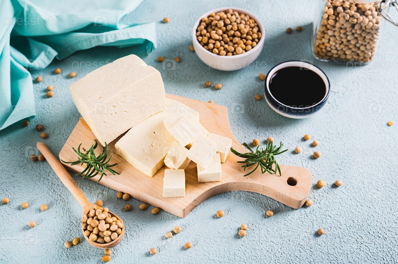 Органический вегетарианский соевый тофу и розмарин на деревянной доске на столе