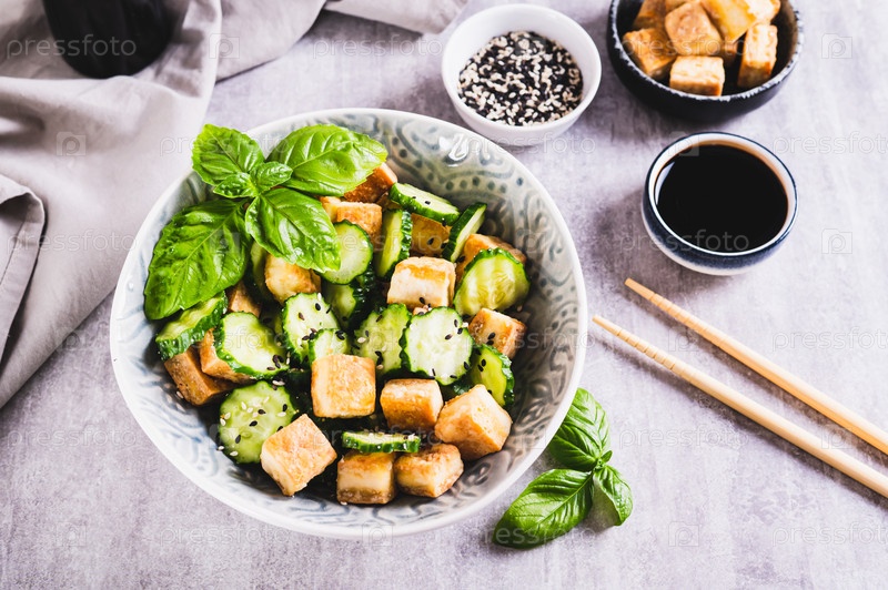 Вегетарианский салат с жареным тофу и свежими огурцами в миске на столе