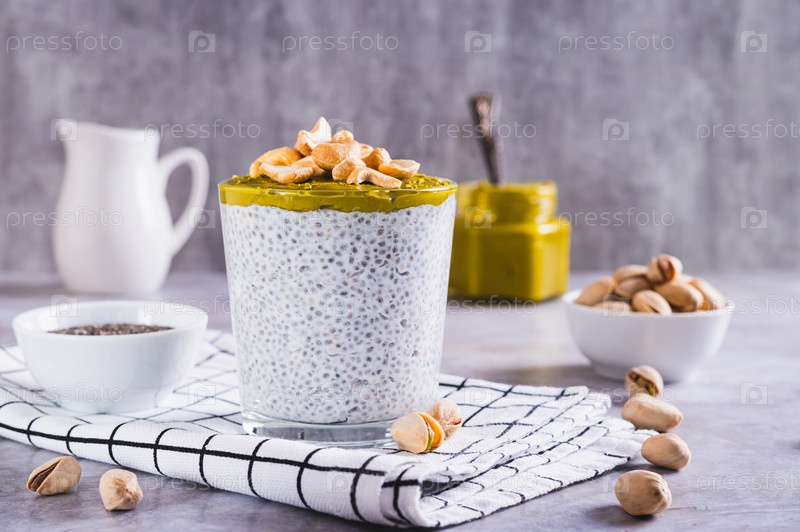 Органический чиа-пудинг с фисташковым маслом и кешью в стакане на столе