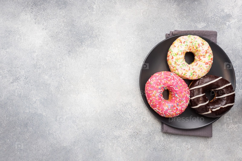 Ассорти из пончиков в глазури на тарелке, вид сверху с местом для копирования