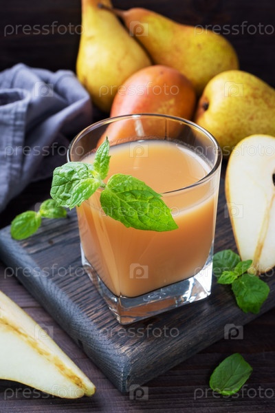 Натуральный грушевый сок в стеклянной чашке. Сочные спелые груши конференции и листья мяты. Темный деревенский деревянный фон
