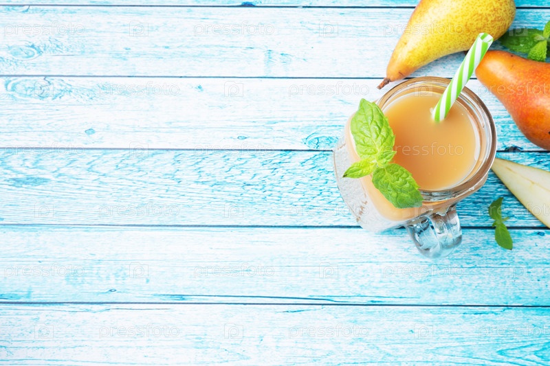 Натуральный грушевый сок в стеклянной чашке. Сочные спелые груши конференции и листья мяты. вид сверху, копия пространства, яркий синий фон