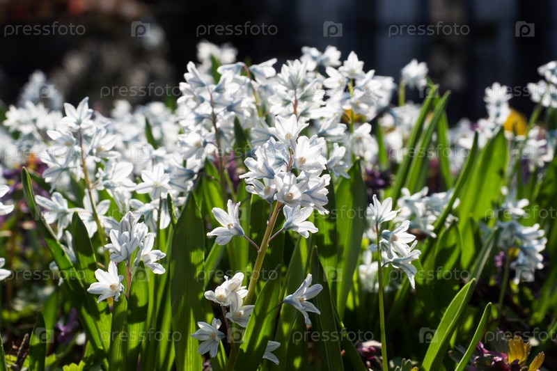 Красивые белые цветы гиацинта, весенняя примула в саду