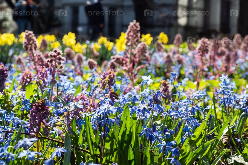 Весенний пейзаж с первоцветами, яркий ковер цветов в парке в солнечный день