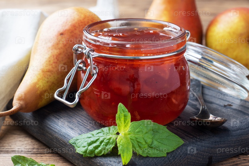 Домашнее грушевое варенье в банке и свежие груши на деревянном фоне