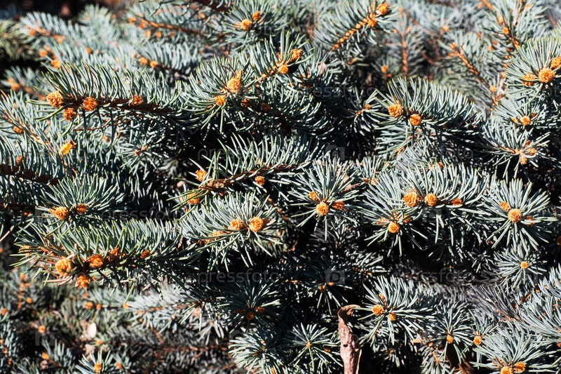 Фон еловых веток сине-зеленый, текстура натуральная. Крупный план