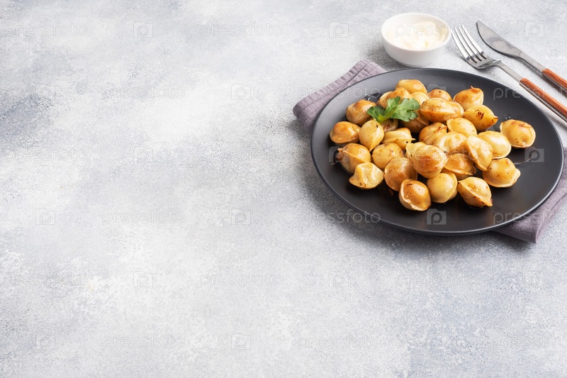 Традиционные жареные пельмени, равиоли, пельмени с мясом на черной тарелке, русская кухня. Серый бетонный фон, пространство для копирования