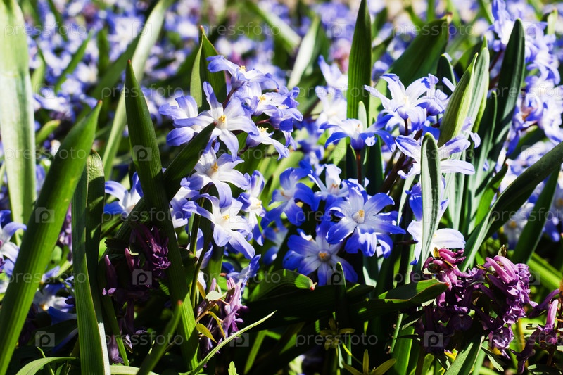 Красивые синие цветы гиацинта, весенняя примула в саду