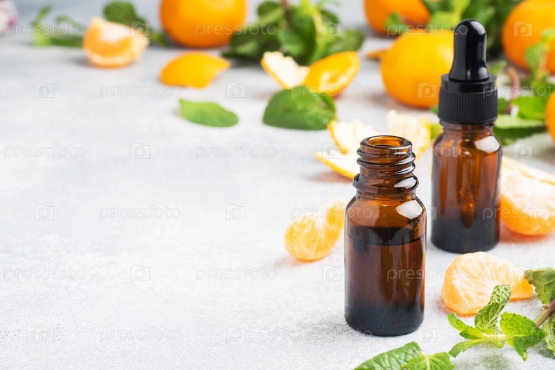 Ароматное мандариновое масло в темном пузырьке, косметическое масло из Мандарина на светло-сером фоне, пространство для копирования