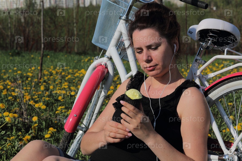 Девушка отдыхает на весенней поляне. Он сидит рядом с велосипедом, ест мороженое и слушает музыку. Цветут одуванчики, растет молодая трава