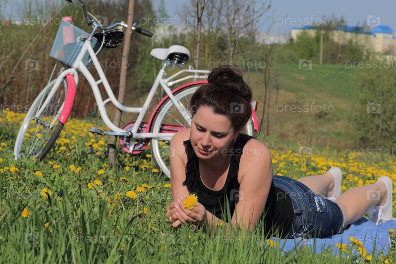 Девушка отдыхает на весенней полянке. Лежит на покрывале. Рядом стоит велосипед. Цветут одуванчики, растет молодая травка