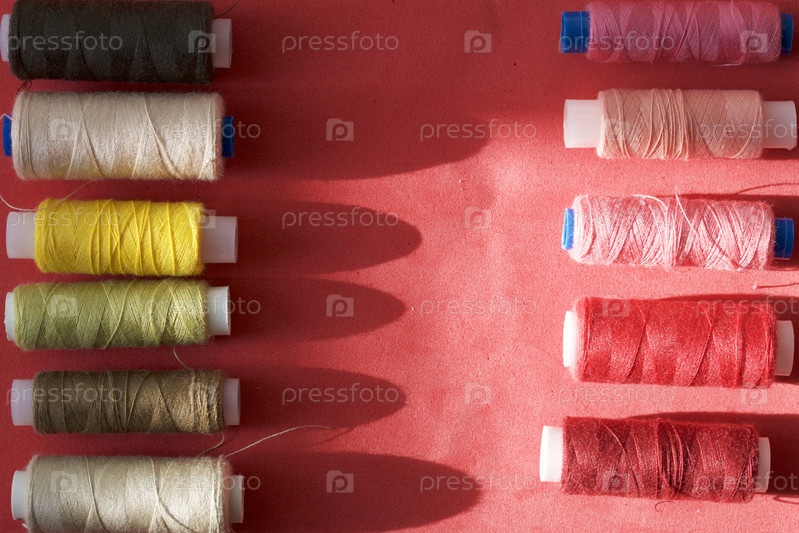 Катушки разных цветов расположены в ряд на розовом фоне