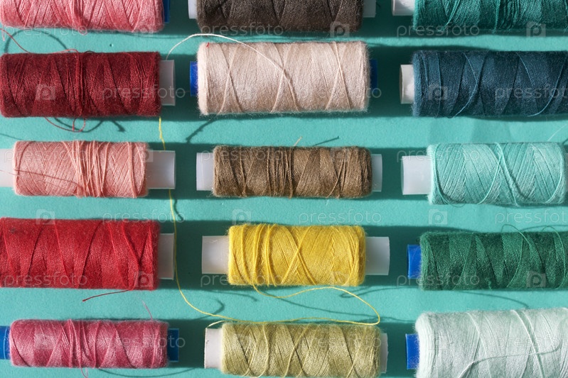 Катушки разных цветов расположены в ряд на бирюзовом фоне