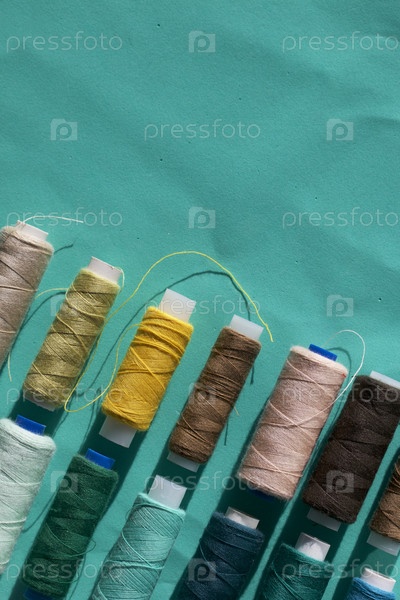 Катушки разных цветов расположены в ряд на бирюзовом фоне