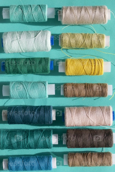 Катушки разных цветов расположены в ряд на бирюзовом фоне