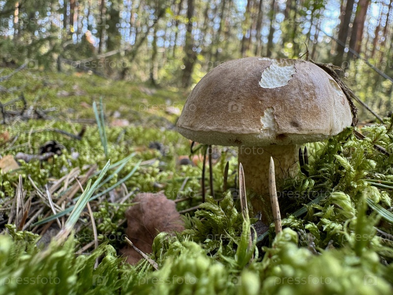 Подберезовик горький. Растет в лесу. Снято на уровне земли. Крупный план