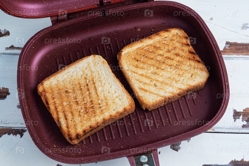 Два поджаренных кусочка хлеба на сковороде-гриль. Крупный план