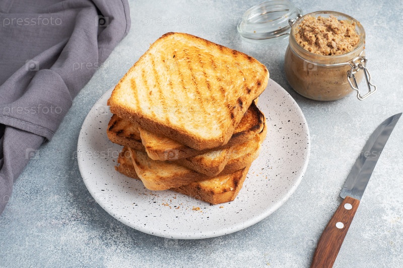 Хлеб тостовый хрустящий для сэндвичей на тарелке на сером бетонном столе. Банка куриного паштета