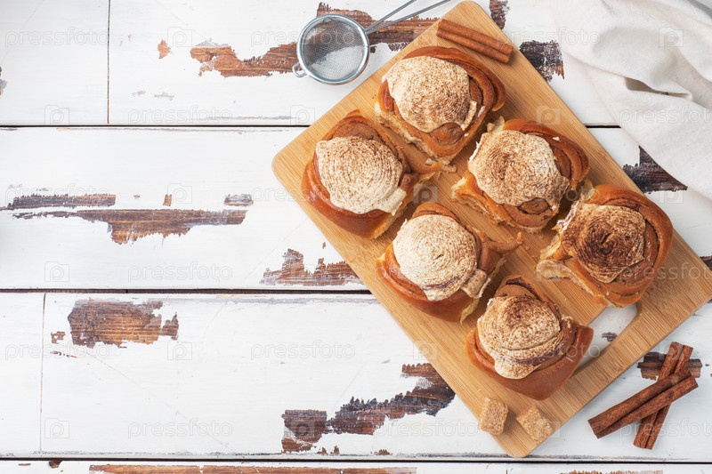 Бублики Kanelbulle с корицей и сливочным маслом на деревенском деревянном столе. домашняя свежая выпечка. вид сверху, место для копирования