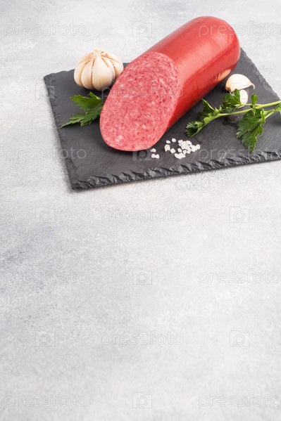 колбаса полукопченая на разделочной доске с петрушкой, специями и чесноком