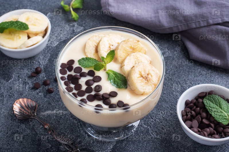 Здоровый завтрак, десерт с молочным йогуртом бананом и шоколадом на тарелке. Темный бетонный фон