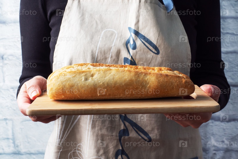 В руках женщины-повара лежит свежий багет хлеба на деревянной доске
