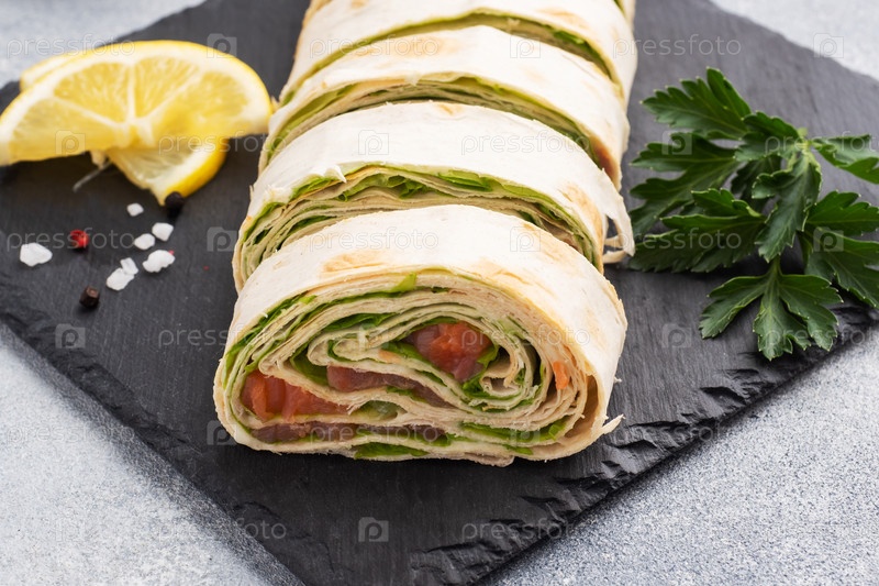Рулетики из тонкого лаваша и соленого лосося с листьями салата на грифельной подставке, серый бетонный фон. Копировальное пространство