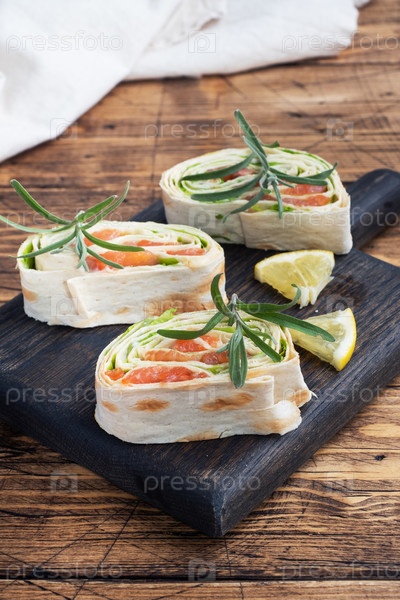 Рулетики из тонкого лаваша и красного соленого лосося с листьями салата на деревянной разделочной доске. Копировать пространство