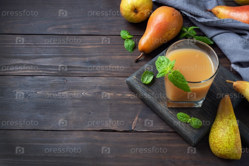 Натуральный грушевый сок в стеклянной чашке. Сочные спелые груши конференции и листья мяты. вид сверху, копировальное пространство, темный деревенский деревянный фон