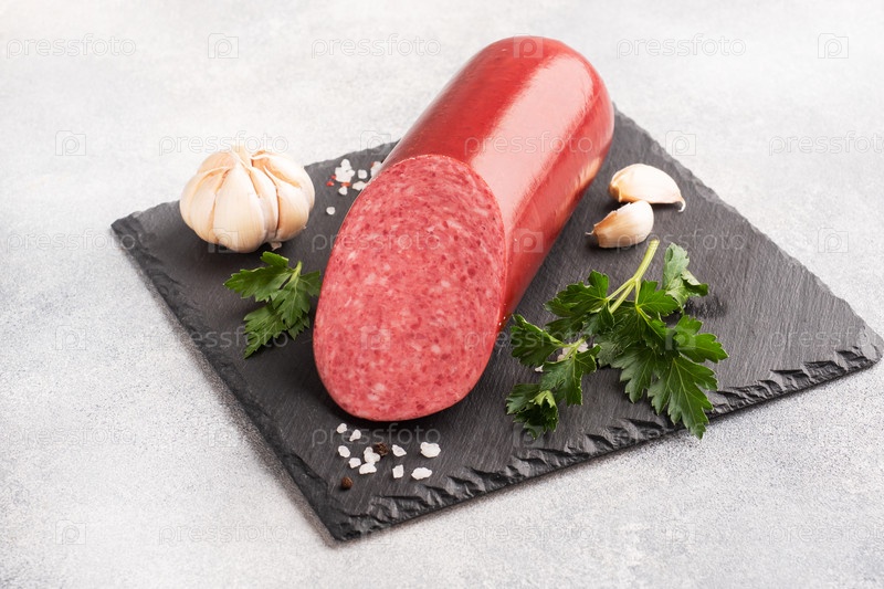 Колбаса полукопченая на разделочной доске с петрушкой, специями и чесноком