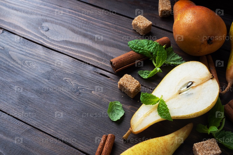 Зрелые сочные желтые груши с корицей на деревянном фоне. Conference груши для карамелизации. Копировать пространство