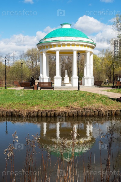 Москва, Россия - 26 апреля 2021 г.: Беседка-ротонда в городском парке Свиблово