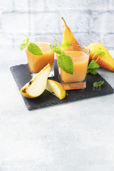 Натуральный грушевый сок в стеклянном стакане. Сочные спелые груши и листья мяты. копия пространства Сланцевая подставка, светлый бетонный фон