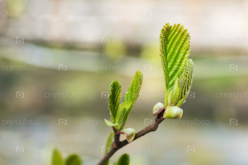 Молодые зеленые листья распускаются весной на ветке дерева. Избирательный фокус