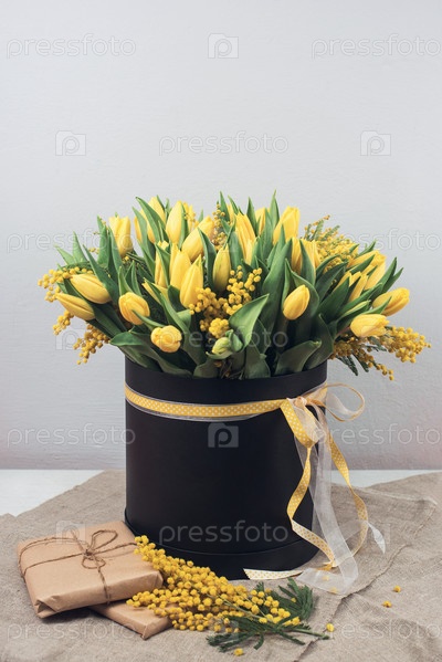 Яркий весенний букет из тюльпанов и мимозы. Тематика ко Дню матери или Пасхе
